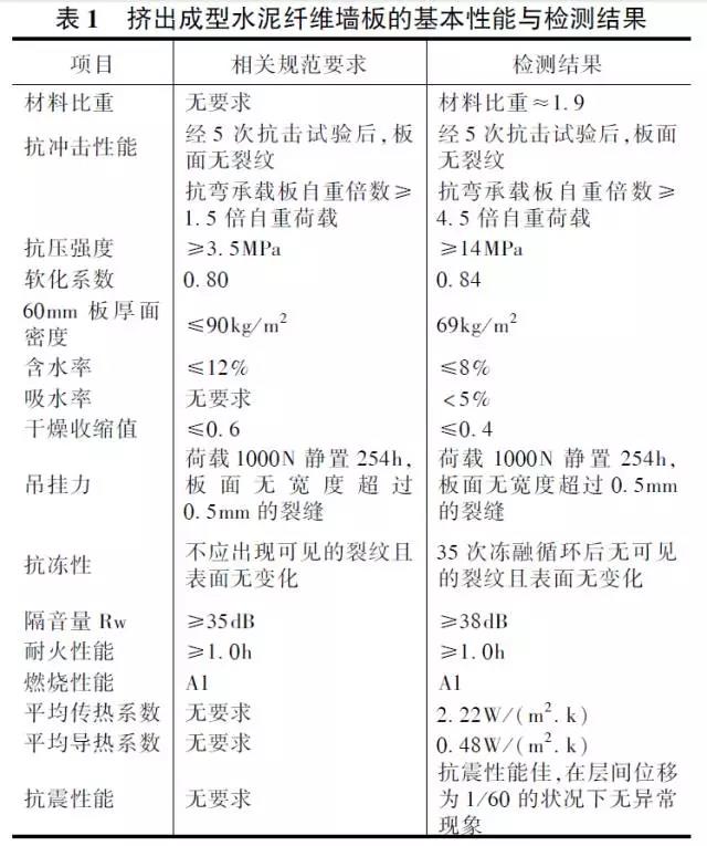 由福泰高科環(huán)??萍?上海)有限公司提供的復(fù)合墻板相關(guān)檢測報告表明,擠出成型水泥纖維墻板完全滿足鋼結(jié)構(gòu)住宅對維護墻板高強、輕質(zhì)、具有良好的保溫隔熱、隔聲、防水、防火、抗裂和耐候等綜合性能的要求,表1為擠出成型水泥纖維墻板的基本性能與檢測結(jié)果與《建筑隔墻用輕質(zhì)條板》JGJ/T169-2005、《建筑用輕質(zhì)隔墻條板》GB/T23451-2009、《建筑材料及制品燃燒性能分級》GB86242006等相關(guān)規(guī)范要求指標(biāo)對比結(jié)果。