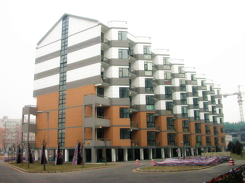 清華大學大石橋?qū)W生公寓,六層高約26米,建筑面積7000㎡。采用H型鋼柱,H型鋼梁,120厚壓型鋼板鋼筋砼樓板。外墻采用175厚NALC藝術板,鉤頭螺栓外掛式安裝;50厚NALC板防火包梁柱。